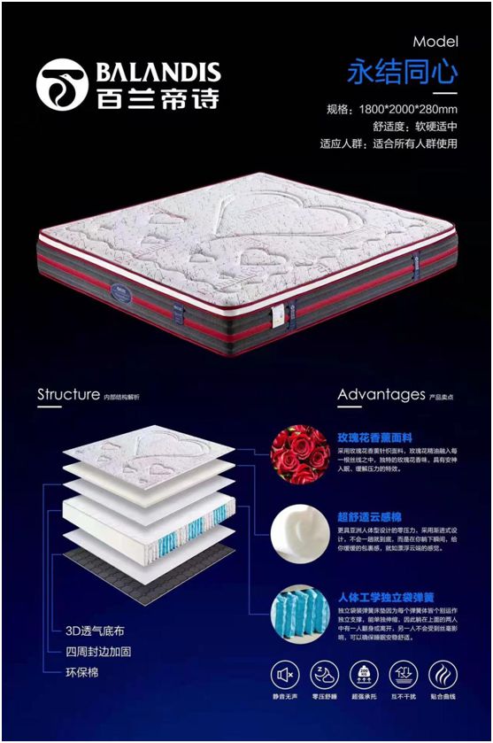 作為健康養生睡眠的守護者,百蘭帝詩家居一直在身體力行,為全球消費者提供集“承托、舒適、耐用”于一體的高品質床墊,幫助消費者享受健康、舒適的睡眠體驗,助你一整天精神煥發,活力滿滿!