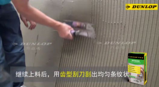 首先將墻面使用D-重磚粘結(jié)劑薄批一層,繼續(xù)上料后,用齒型刮刀刮出均勻條紋。將陶瓷板板背面薄批一層D-重磚粘結(jié)劑,繼續(xù)上料后,用齒型刮刀刮出均勻條紋狀。