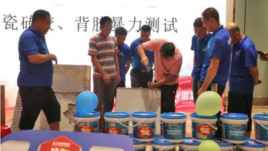 都說自家產(chǎn)品牛,但我們固萊不一樣,我們是話少產(chǎn)品好,低調(diào)又謙遜的實力派。有實驗有真相,活動現(xiàn)場特意進行了一場瓷磚膠、背膠性能打雜測試,眾目睽睽之下,驗證了固萊的瓷磚膠、背涂膠到底有多牛。