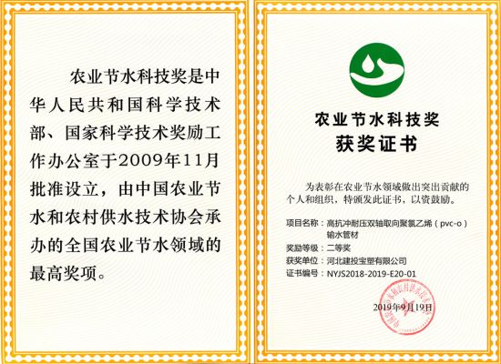會議期間,建投寶塑作為理事單位見證了中國農業節水和農村供水技術協會農村供水分會的成立,并且建投寶塑的“高抗沖耐壓雙軸取向聚氯乙烯(PVC-O)輸水管材”榮獲“農業節水科技獎”,參與研發的建投寶塑技術人員榮獲“農業節水科技獎”。“農業節水科技獎”是中華人民共和國科學技術部、國家科學技術獎勵工作辦公室于2009年11月批準設立,由中國農業節水和農村供水技術協會承辦的全國農業節水領域的最高獎項。