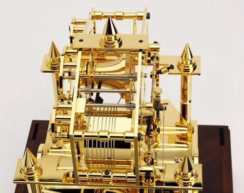 富麗堂皇的桃花心木底座之上,水晶透明斜邊玻璃罩之中,是璀璨奪目而不落俗套的走珠鐘主體:手工打造全黃銅24K鍍金機(jī)芯,機(jī)械鐘界“超小”鐘面與其他齒輪零部件融為一體,似乎在宣告自己戰(zhàn)火中出生的傳奇身世,豈是那些安居于民宅的普通機(jī)械鐘可比。