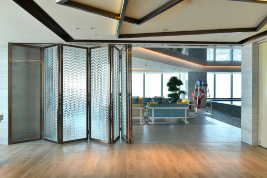 為室內空間劃分提供靈活的解決方案,是封閉超大門洞的最佳選擇。能整體打開,也能按需要局部開放,適用于木門或帶框門扇。門扇側置安裝時,單邊超過兩扇,必須使用地軌。如果門扇中置折疊門一側不用平開門是可以不選用地軌的。