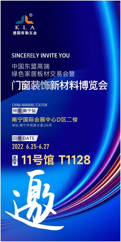 2022中國東盟高端綠色家居板材交易會暨·門窗裝飾新材料博覽會(以下簡稱:2022 南寧建博會)將于6月25-27日在南寧國際會展中心隆重召開。屆時,央視展播品牌——德國庫勒五金也將攜帶系列產品亮相此次行業盛會。