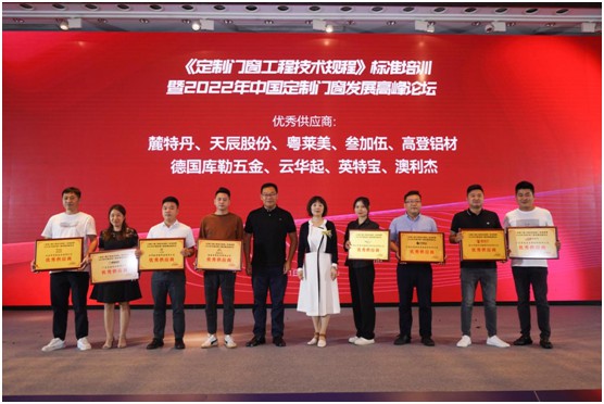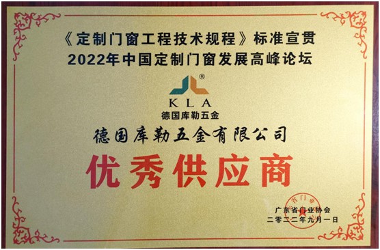 2022年9月1日,“《定制門窗工程技術規程》標準培訓暨2022年中國定制門窗發展高峰論壇”在佛山希爾頓酒店隆重舉辦。庫勒五金受邀出席,并在頒獎典禮現場榮獲“優秀供應商”榮譽!