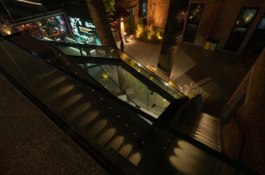 投射在臺階上的光線,為黑暗的環境增加光指引作用,引導人們順著樓梯拾級而上,登上院中的露臺,彼時,小院與周圍景致盡收眼底。