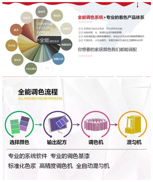 2000年,數(shù)碼彩正式推出了中國(guó)第一套集內(nèi)外墻乳膠漆、真漆、聚酯白漆、彩色透明面著色、底著色于一體的全能調(diào)色系統(tǒng),利用數(shù)字化電腦調(diào)色,可以調(diào)配出無數(shù)可能性的絢麗色彩,快速而準(zhǔn)確地為客戶提供色彩搭配方案。