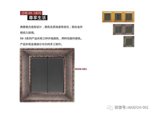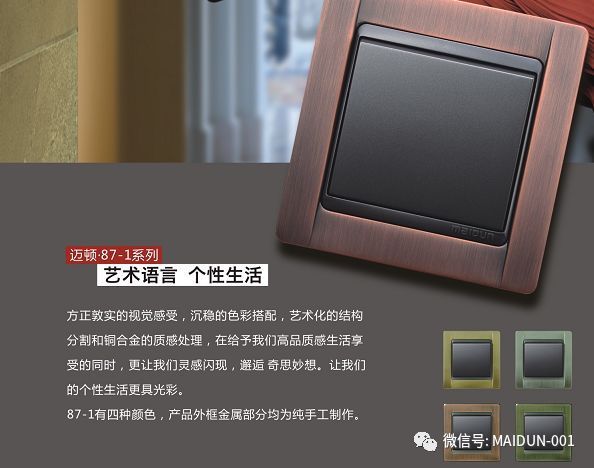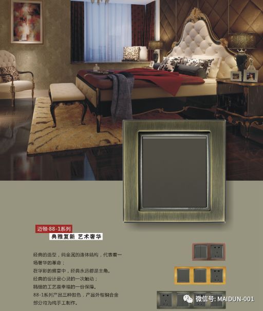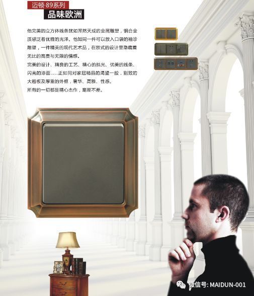 邁頓全銅開關在產品紋路上有采用中式方柱,歐式羅馬柱,法式雕花等等元素,通過完美的設計,優美的線條,精良的制作工藝,以及精細的考究,使得成品彰顯貴族風格,高貴典雅。追求簡潔自然之美的同時保留了各自文化的線條輪廓特征,在風格呈現各自風格的文化底蘊;在細節上,也強調開關的舒適度和時代感。
