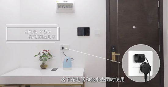 此處推薦公牛G28斜五孔插座,采用二三插錯位排列的方式,增大插座間距,二三插座不碰頭,這樣家中充電器和家用小電器就能同時使用了,超級省心。