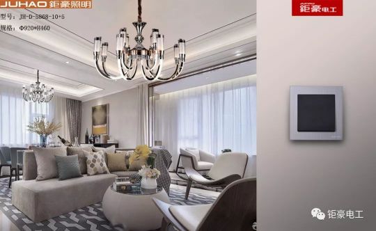開關搭配方案:平板水晶燈的華麗,需要搭配奢華的拉絲鋁+黑色幾何開關,開關融入現代感中帶有奢華的風格,與水晶燈想呼應,從而體現了主人的富有與品位。