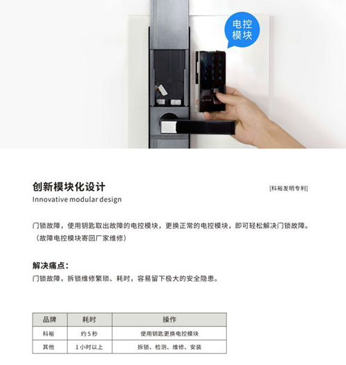 2、獨創的創新模塊專利技術中,較為突出的“快裝、快修”功能特點的技術堪稱為史詩級別,完美解決用戶在使用智能鎖過程中產品出現無法使用等問題。然而用戶也無需擔心門鎖因電子模塊故障而無法正常使用,只需要將鑰匙轉到開門狀態即可取出電控模塊,門鎖仍然可正常開啟使用,不會影響用戶家庭的出入問題;電控部分模塊則可直接快遞寄回科裕售后服務中心維修,維修好的電控模塊再寄回,消費者安裝好后,智能鎖就會完全恢復原樣。這種“無憂使用+無憂故障+無憂售后”產品模式,完全消除并解決了消費者的后顧之憂,這種顛覆傳統、符合消費者需求的創新技術,是真正便利人類的智能鎖技術。