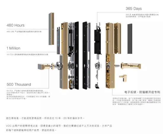 作為智能鎖產業的領先品牌,VOC集自主研發、生產、銷售、售后于一體,幾乎涉及到整個產業所有的環節,自然能夠深刻體會消費者對安全迫切渴求,故而極度重視產品品質和產品研發。多年來,VOC深耕品質安全,深入每一個細節,嚴格采用遠高于行業的檢驗標準,為累計超過500萬用戶提供安全防盜、品質卓越的智能門鎖產品。