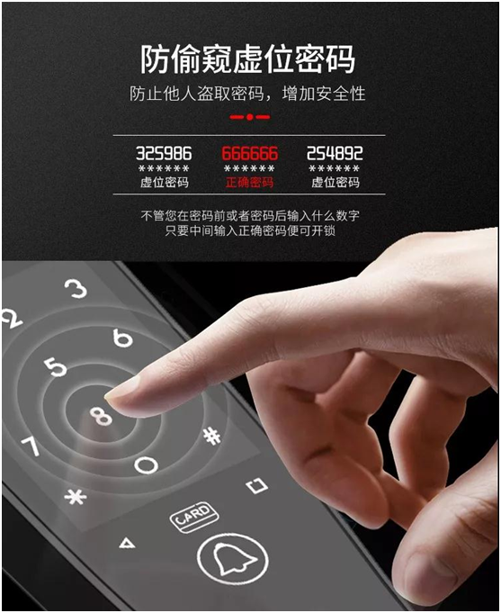 現在,出于多一重安全性需求,具備虛位密碼技術的智能門鎖自然比沒有虛位密碼的智能門鎖安全性更高,但是也不是絕對的安全,因此我們在使用密碼開鎖的時候,一定要妥善保護好密碼,謹防被別有有心之人盜去。