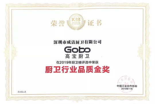 2019年11月2日,在中國廚衛行業高峰論壇上,Gobo高寶廚衛憑借過硬品質和超高市場口碑獲得“廚衛行業品質金獎”這一殊榮。中國廚衛行業高峰論壇是行業中最具有影響力的峰會之一,Gobo高寶廚衛作為獲獎企業之一,深感榮幸與驕傲。