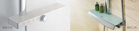 恒潔雨沐花灑采用人性化的實用設計,置物面板上設計了功能按鈕,從左至右分別為下水龍頭、頂噴花灑、手持花灑、一鍵暫停按鈕,可以根據需要同時開啟1種到3種功能,且能直觀明了地清晰分辨哪種功能正在工作,誤判的尷尬從此不會再有。最右邊的恒溫旋鈕解決了沐浴時水溫冷熱不均的問題,旋鈕內部設置恒溫棒,能通過對冷、熱水的進水量控制來保證出水恒溫。一般情況下,旋鈕自動停留在中間38℃人體沐浴最舒適的溫度之上,同時也可根據個人需求進行調節:往右旋轉輕松調低溫度,按住旋鈕下方的童鎖按鈕同時往左旋轉能調高溫度,童鎖按鈕則考慮到防止小孩誤操作導致燙傷。