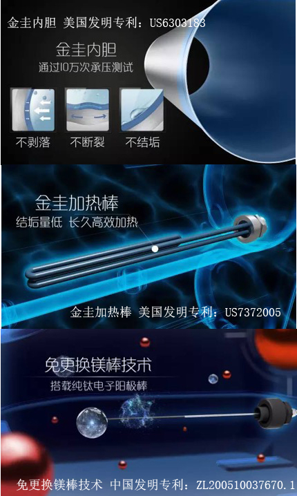 此外,為了避免用戶定期更換鎂棒帶來的不便,在上述金圭系統(tǒng)的基礎上加載了一項專利技術:免更換鎂棒技術,該技術實時檢測熱水器內(nèi)膽中的腐蝕顆粒,釋放中和顆粒,防止內(nèi)膽被腐蝕,同時實現(xiàn)零消耗,不用更換。