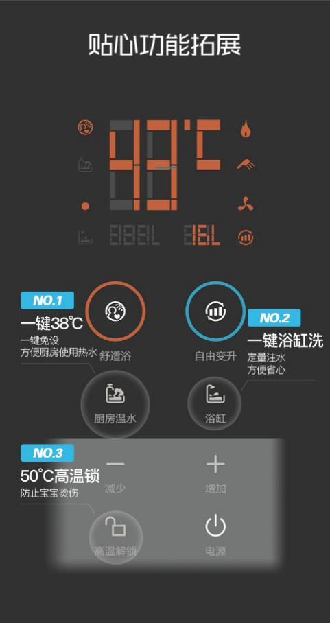 華帝i12034智能恒溫燃氣熱水器,具有一鍵自由升降功能,可根據用水量自動調節出水量。根據一人或多人同時使用熱水器的不同情況,可以控制水溫和水流,從而節約用水,保持水質穩定。