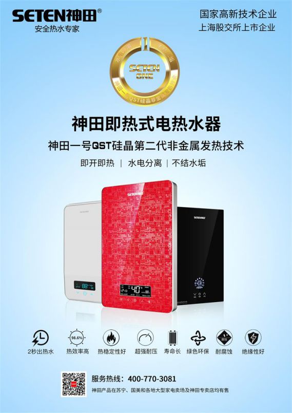 王艷介紹,當時選擇代理神田電熱水器,就是看中了神田一號的技術。作為第二代的非金屬發熱技術,神田一號QST硅晶管采用高絕緣管壁外加熱,水電完全分離,安全性能優異,徹底改變了傳統電熱水器將220V電熱管浸泡在水中發熱易結水垢易漏電的歷史;從物理上避免了金屬發熱體易發生的漏電傷人危險。神田一號秒快速出熱水,熱啟動速度快,熱慣性小,具有超強的導熱性能保障了超高的熱效率,接近約98.6%;可承受高達25公斤的破壞性試驗,使用壽命長達20年以上。純電阻負載,無電磁輻射,無瞬間沖擊電流,保證家居用電安全。