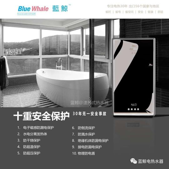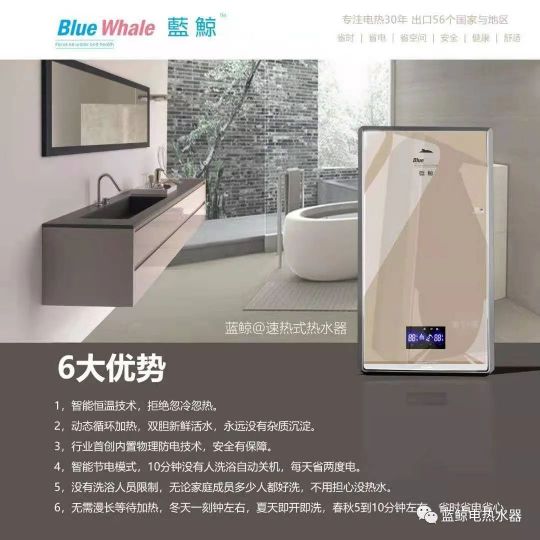 藍鯨速熱式電熱水器,春夏秋季節可快速加熱,冬天預熱3至10分鐘,便能有恒溫熱水供應,十分快捷方便,不受洗浴人數限制,滿足時下人們快節奏的生活節奏。