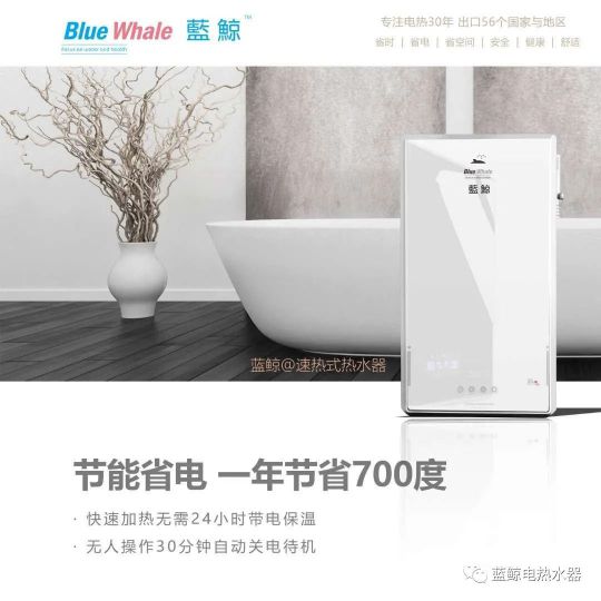藍鯨速熱式電熱水器因預熱時間非常短,所以幾乎沒有熱能量散失,用時打開不用時就關閉,用多少水就熱多少水,沒有像儲水式熱水器這樣,需要全膽加熱,浪費洗澡剩下的熱水能耗,真正做到了省電省水。