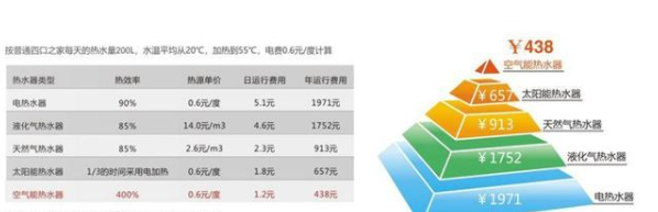 以一般4口之家每一天使用200L熱水來(lái)估算,水溫均值從15℃加熱至55℃,米特拉空氣能熱水器所需費(fèi)用開(kāi)支等同于電熱水器和液化氣熱水器的1/4,天然氣熱水器的1/2,太陽(yáng)能熱水器的2/3。