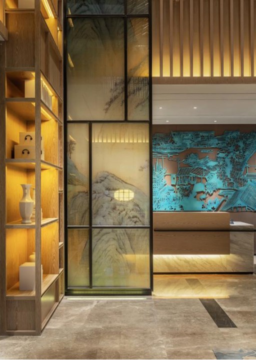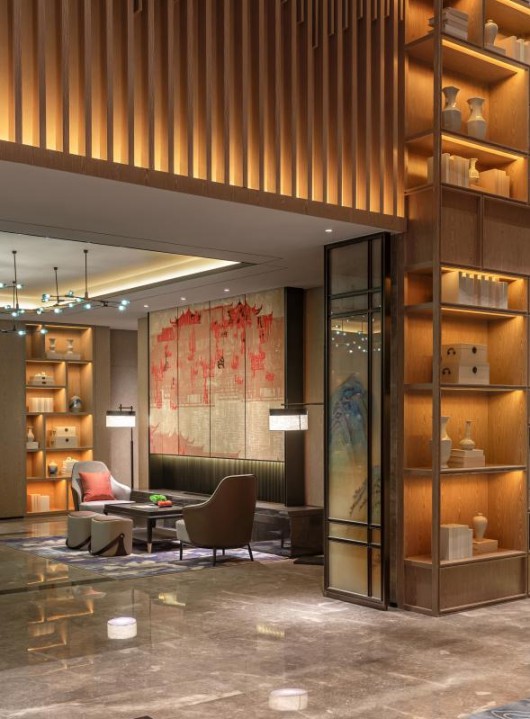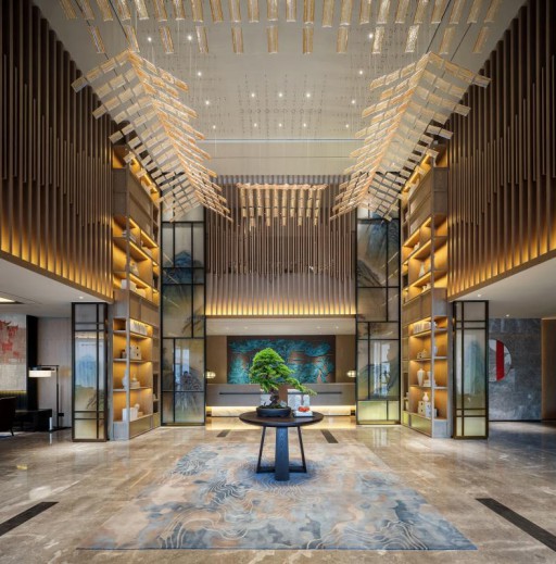酒店大堂延續(xù)外立面的建筑元素,將四合院的屋頂形態(tài)藝術(shù)化的表達(dá),運用現(xiàn)代的琉璃材質(zhì),塑造現(xiàn)代的時尚與輕奢感。墻面自然元素的屏風(fēng)與木格柵,營造現(xiàn)代簡潔的和諧之美。