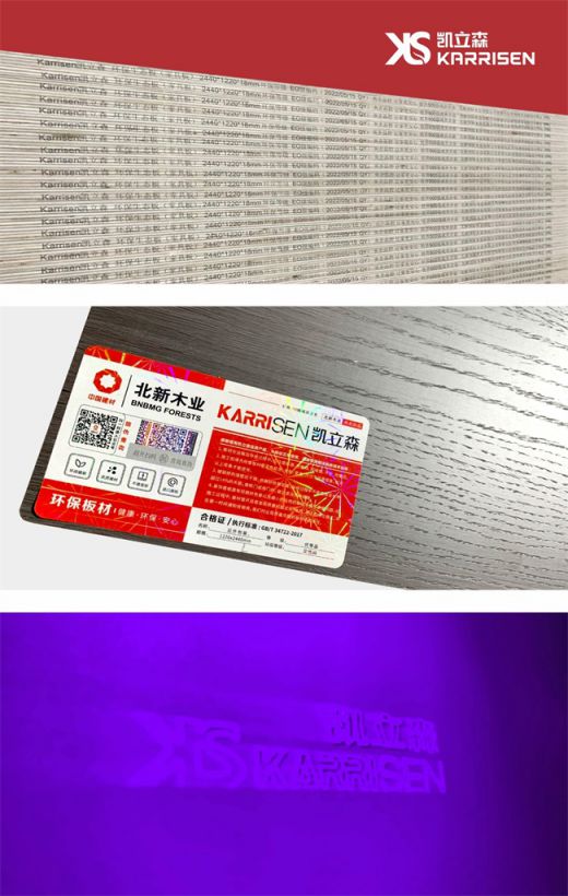 Karrisen凱立森?擁有三重產(chǎn)品防偽標(biāo)識(shí):(1)每張凱立森多層實(shí)木家具板的側(cè)面都有“Karrisen凱立森”專用噴碼標(biāo)識(shí);(2)每張?jiān)谑鄣腒arrisen凱立森?多層實(shí)木家具板板身都有合格證,帶有防偽標(biāo),可以進(jìn)行防偽查詢;(3)每張Karrisen凱立森?多層實(shí)木家具板飾面在紫外線光的照射下,都會(huì)出現(xiàn)“Karrisen凱立森?”的隱形防偽標(biāo)識(shí)。