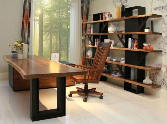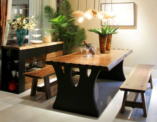 從照片中不難看出,原生態實木系列保留了黑胡桃木原始的樹干輪廓,以及天然形成的樹節,未經修飾的色澤與紋理坦然躍于家具表面,原始、粗獷的氣息撲面而來,讓鋼筋結構的都市空間回歸原始清新的自然森林,如一股清流貫穿居室空間。