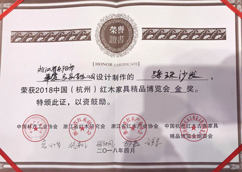 華廈·大不同《踩珠沙發》榮獲“2018中國(杭州)紅木家具精品博覽會金獎”榮譽證書