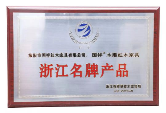 國祥紅木建立迄今屢獲殊榮,已喜獲“浙江名牌產(chǎn)品”、“浙江省知名商號”、“浙江省林業(yè)重點龍頭企業(yè)”、“東陽市木雕·紅木家具骨干企業(yè)”等許多殊榮。