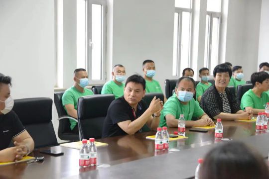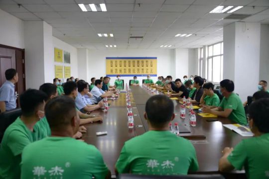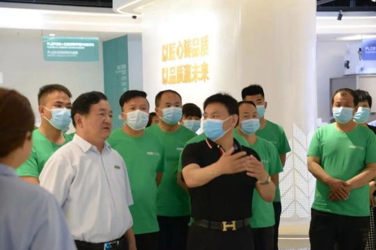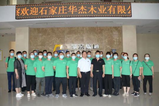 6月3日,華杰木業董事長彭志軍,總經理彭欽泊及生產部、人資部、研發部等50余人團隊一行到訪河北蘋樂集團參觀交流。