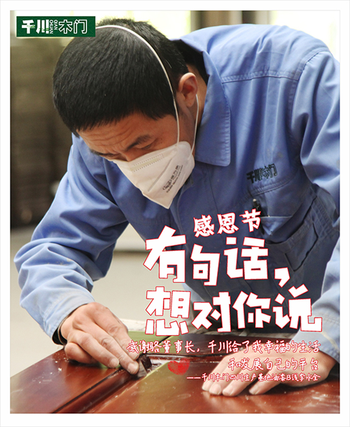 湖北生產基地門扇車間拼枋組阮海燕:人生天地,常懷一顆感恩的心!感謝父母的養育之恩!感謝朋友的理解和包容!感謝千川公司給我就業平臺, 讓我可以在自己的家鄉努力工作,好好生活。