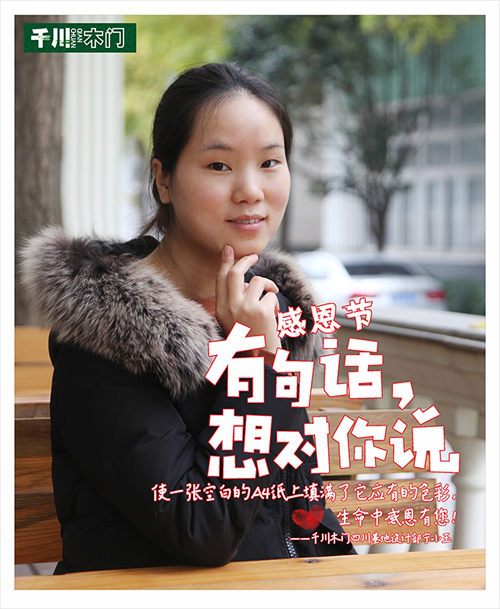 四川生產基地人事行政部姜志瓊:在感恩節我最想感謝的是各級領導,尤其是人事行政部經理茍楊,因為在平常的工作中,她給了我很大的肯定,讓我對自己的工作充滿了信心和干勁。同時也要感謝千川,給了我一份滿意的工作。