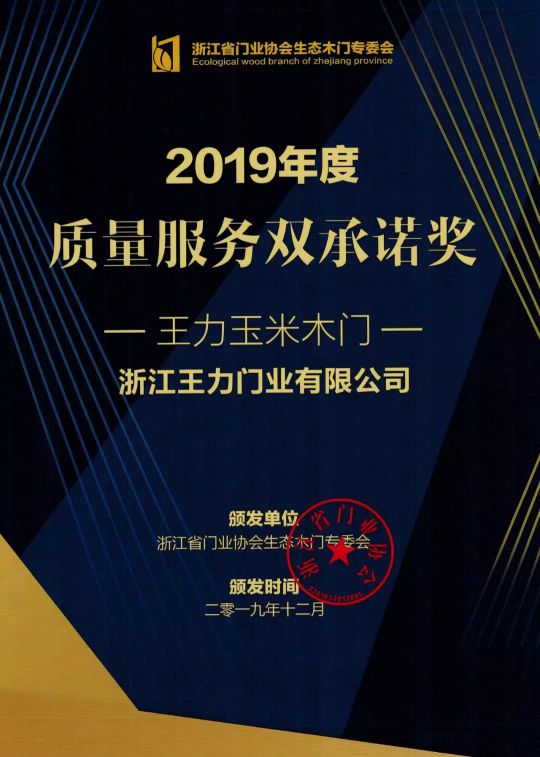 王力玉米木門榮獲“2019年度質量服務雙承諾獎”