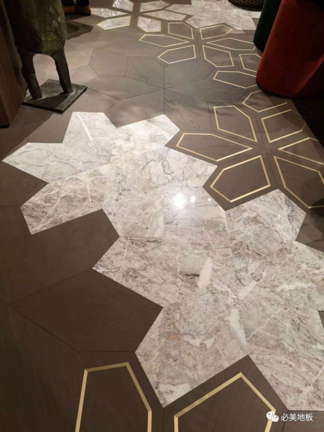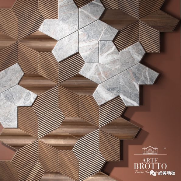 出自意大利菲列德羅的設計團隊,全新破土而出的Azalea拼花地板用美國胡桃木制作而成,表面經過拉絲、上色和清漆處理,制造出具有黃銅和大理石鑲嵌的效果。Azalea拼花
