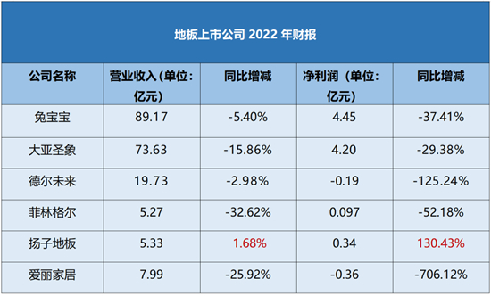 在疫情沖擊、房地產(chǎn)景氣度下降、毛利下滑等因素的沖擊下,2022年,地板上市公司普遍業(yè)績慘淡,除了揚子地板營收、凈利有所增長外,兔寶寶、大亞圣象、菲林格爾、德爾未來、愛麗家居五家企業(yè)的營收、凈利均出現(xiàn)不同程度的下滑現(xiàn)象,放眼望去只有慘淡和更慘淡之分。