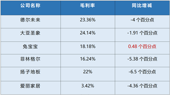 從數(shù)據(jù)來看,除了兔寶寶的毛利率增長了0.48個百分點之外,其他五家均有下滑。其中,大亞圣象的毛利率更是創(chuàng)下9年來最低水平。