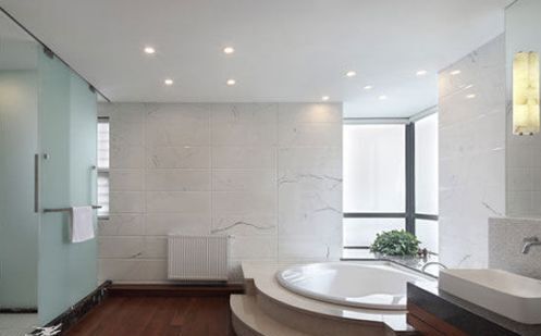 浴室地板圖片3:這款浴室因為做了很好的干濕分離,設計師毫不吝嗇的鋪設了實木地板,讓寒冷冬天的沐浴時光也同樣舒適。整個空間呈現了最淳樸的白色和原木色搭配,同時配備淋浴間和浴缸既讓空間不顯空曠,浴室功能也更豐富起來。光源上,選擇了暖色吊燈和小射燈的組合,更節約電力,也讓光照的范圍更廣。