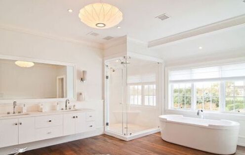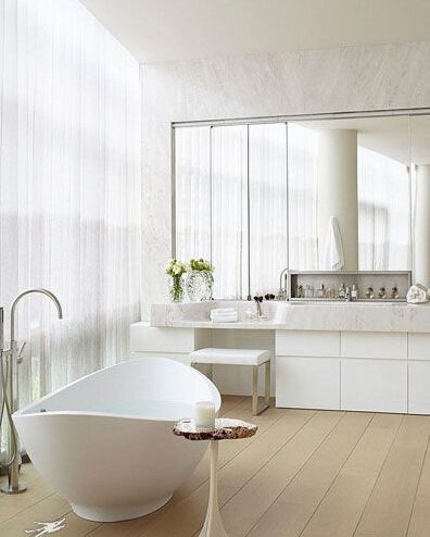 浴室地板圖片5:這款大面積落地窗的浴室,以白色為裝修主調,白色的流線型浴缸和白色的盥洗盆,加上大面積的鏡子,讓空間更清透,視覺空間感更強。地面鋪設大塊的強化地板,原木色調更能襯托出白色的純潔無暇。
