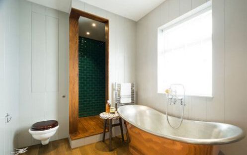 浴室地板圖片2:這款浴室一改以往傳統的衛浴間設計,設計師將它打造的與臥室等公共空間一樣,實木地板的鋪設增加了空間的沉穩大氣感,而白色浴缸則又為空間增添了些許典雅格調,清雅宜人。