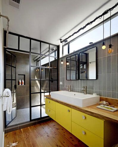 浴室地板圖片6:木質地板作為浴室空間的設計,是一種大膽的嘗試。這款淋浴間設計,保留了原始結疤紋理的木質地板,讓人有種回歸自然的感受。淋浴間以玻璃窗格來格擋,干濕分離清潔更方便。黃色的浴室柜與原木色地板色彩過渡自然清新。