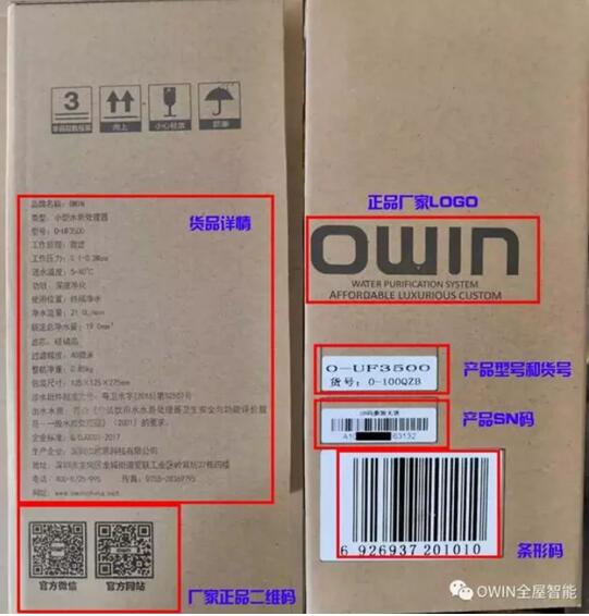 圖:OWIN凈水器具有正規(guī)的防偽標簽