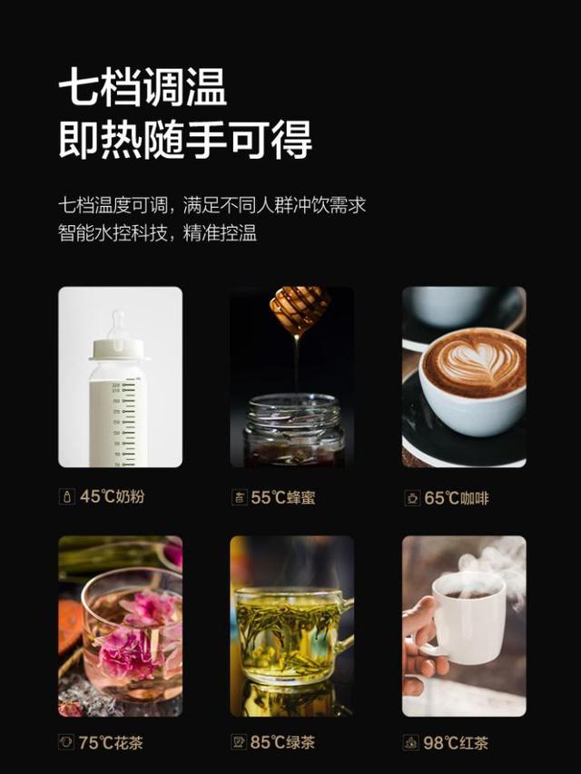 除此以外,還有7檔溫度可以用來智能調節(jié),滿足生活中不同場景的需求,比如,45℃沖奶粉,55℃沖蜂蜜水,65℃沖咖啡,75℃泡花茶,85℃泡綠茶,98℃泡紅茶等等。