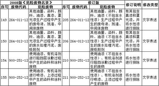 而在這部未出臺的《名錄》,新聞報道提到,經(jīng)過中國涂料工業(yè)協(xié)會多次與相關(guān)國家部委反應呢的情況,根據(jù)收到的國家工信部節(jié)能司“關(guān)于征求《國家危險廢物名錄(修訂)》(報批稿)意見的函”,在最近新修訂的《國家危險廢物名錄(修訂)》(報批稿)中,將涂料生產(chǎn)和使用環(huán)節(jié)產(chǎn)生危險廢物的條目中加入“不包括水性漆”的括號注釋,即水性涂料生產(chǎn)和使用過程中產(chǎn)生的廢物將不被列為危險廢物。其具體項請看: