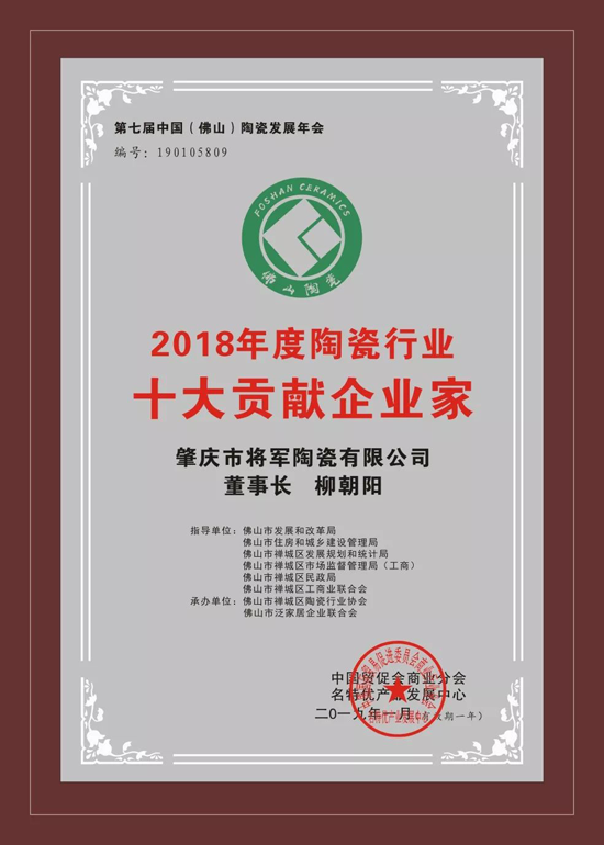 大將軍—— “2018年度陶瓷行業(yè)十大貢獻(xiàn)企業(yè)家”