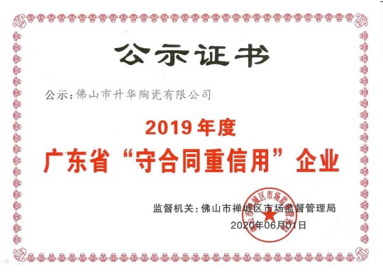 近日,廣東省市場(chǎng)監(jiān)督管理局對(duì)2019年度“廣東省守合同重信用”企業(yè)進(jìn)行公示,升華陶瓷順利通過終審,并獲頒榮譽(yù)牌匾和榮譽(yù)證書。