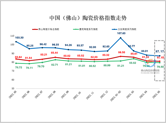 2023年5月份佛山陶瓷價格總指數報81.03點,環比跌0.30,環比跌幅0.37%。建筑陶瓷系列指數報79.50點,環比跌0.16,環比跌0.20%;衛生陶瓷系列指數報87.17點,環比跌0.84,環比跌幅0.95%。5月三大類指數齊齊下跌,佛山陶瓷市場交易逆勢下行,多數代表品跌幅加大,市場行情整體下滑。