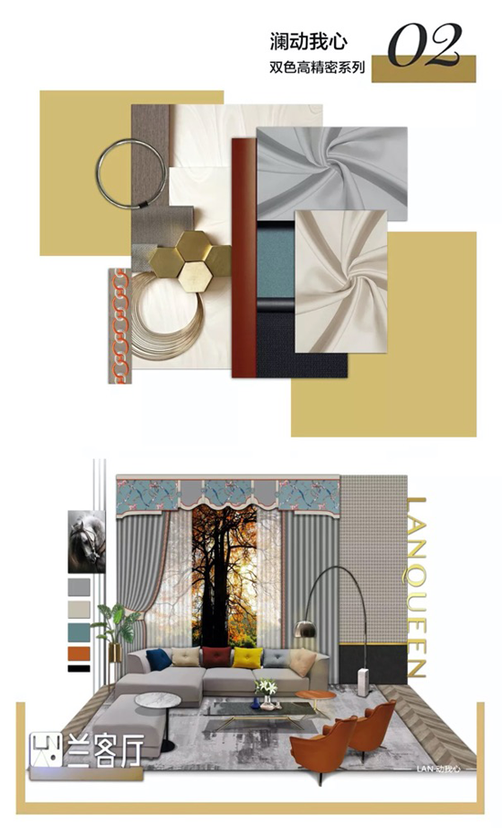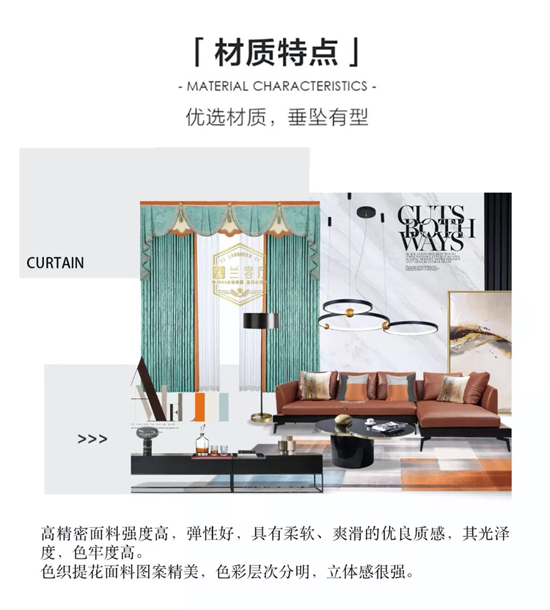 本款窗簾的設計賦予了空間更多的魅力,在高級灰簾身面料上裝飾一抹明艷的橘色花邊,冷與暖的交融在呈現輕奢格調的同時也完美詮釋出設計本該有的明媚感與輕松感。幔上愛馬仕風格繡花布的運用讓活力充盈整個設計,當極富魅力的款式和色彩占據著視線,當動與靜的旋律纏繞出時尚的韻味, 整個空間都洋溢著一種自由奔放的態勢,瀾動著你我之心!