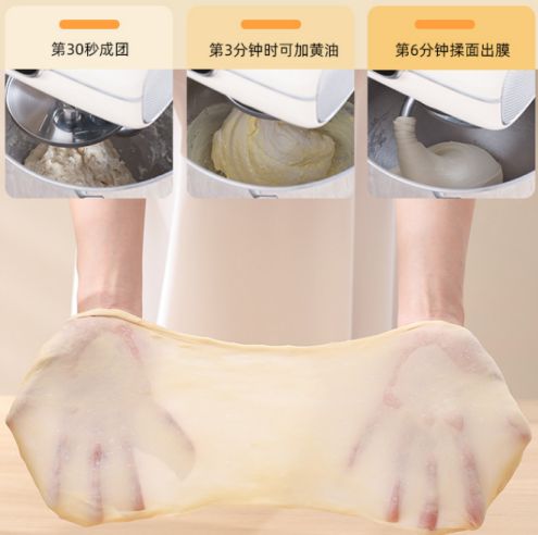 根據君焙實驗室高達3000次的實驗數據顯示,君焙廚師機的揉面出膜時間在10-13分鐘,區別于市面上其他廚師機產品的優勢在于,即使如此快速的出膜,君焙廚師機仍不需要做任何的控溫處理,也能精準控制面團溫度在合適的范圍內。當然,目前為了應對各種苛刻面溫要求,我們也給大家提供冰袋輔助降溫,如果經常制作高面溫要求作品的粉絲可以自由加gou。