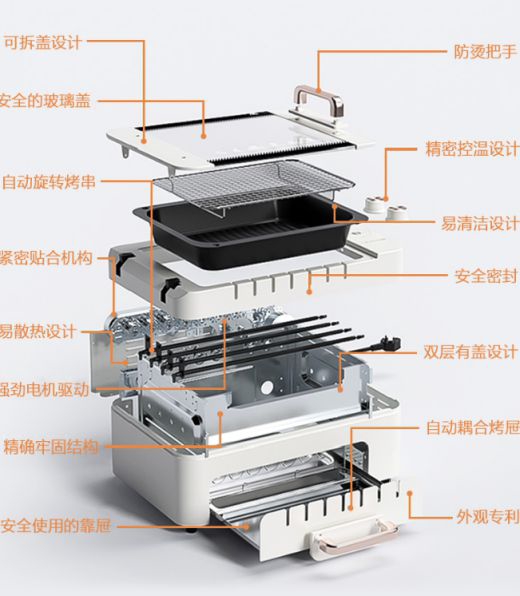 同時(shí),由于不直接接觸發(fā)熱管,燒烤時(shí)不產(chǎn)生油煙,這樣一來(lái)不僅可以解放雙手,更重要的是再也不需要忍受著撲面的煙熏火燎守在烤架前,弄得灰頭土臉滿身油膩,也一樣可以達(dá)到想要的燒烤效果,即便是烹飪小白,也能盡情享受擼串帶來(lái)的快樂。