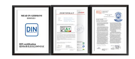 DIN德國工業標準認證、法國揮發性有機化合物環境甲級+認證、德國藍天使環境認證